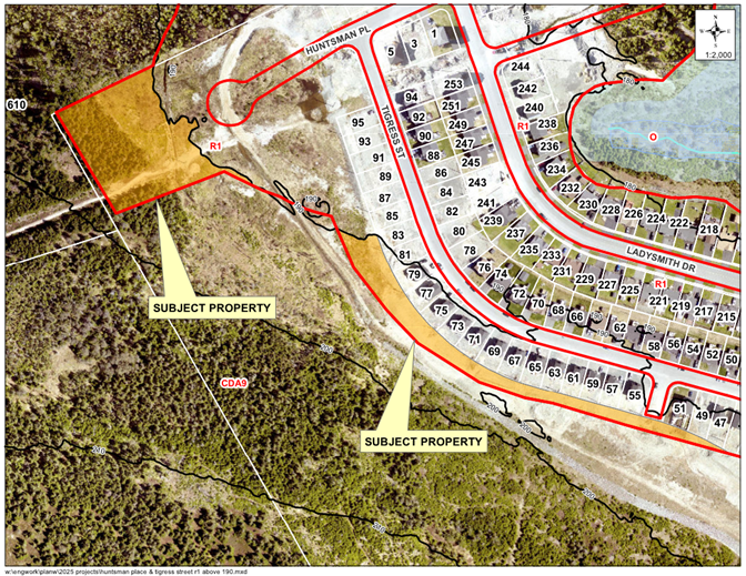 The City is considering rezoning land at 500 Kenmount Road above the 190-metre contour elevation, near Huntsman Place and Tigress Street, from the Residential 1 (R1) Zone to the Comprehensive Development Area 9 (CDA 9) Zone.